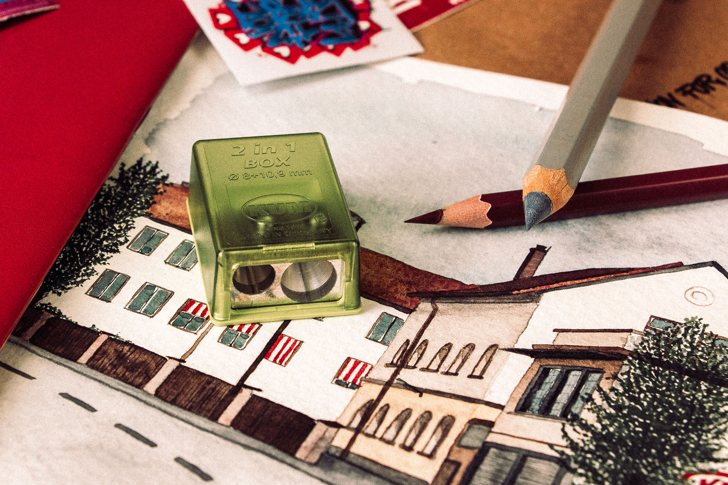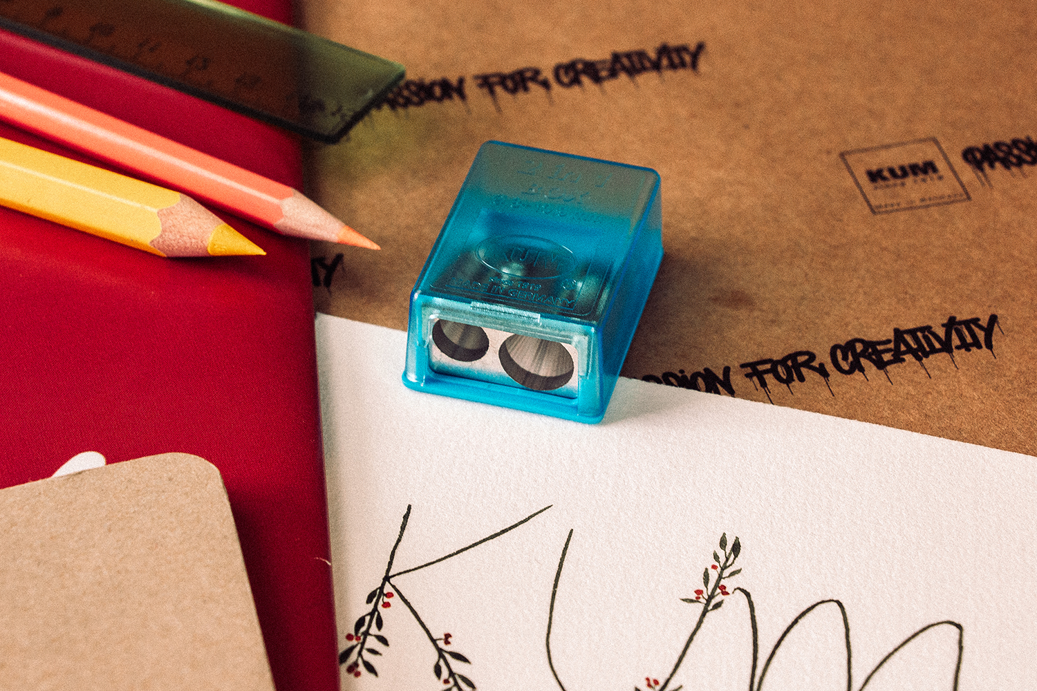 A double sharpener with a small container for pencils with a diameter of 8 and 11 mm in three different colors.